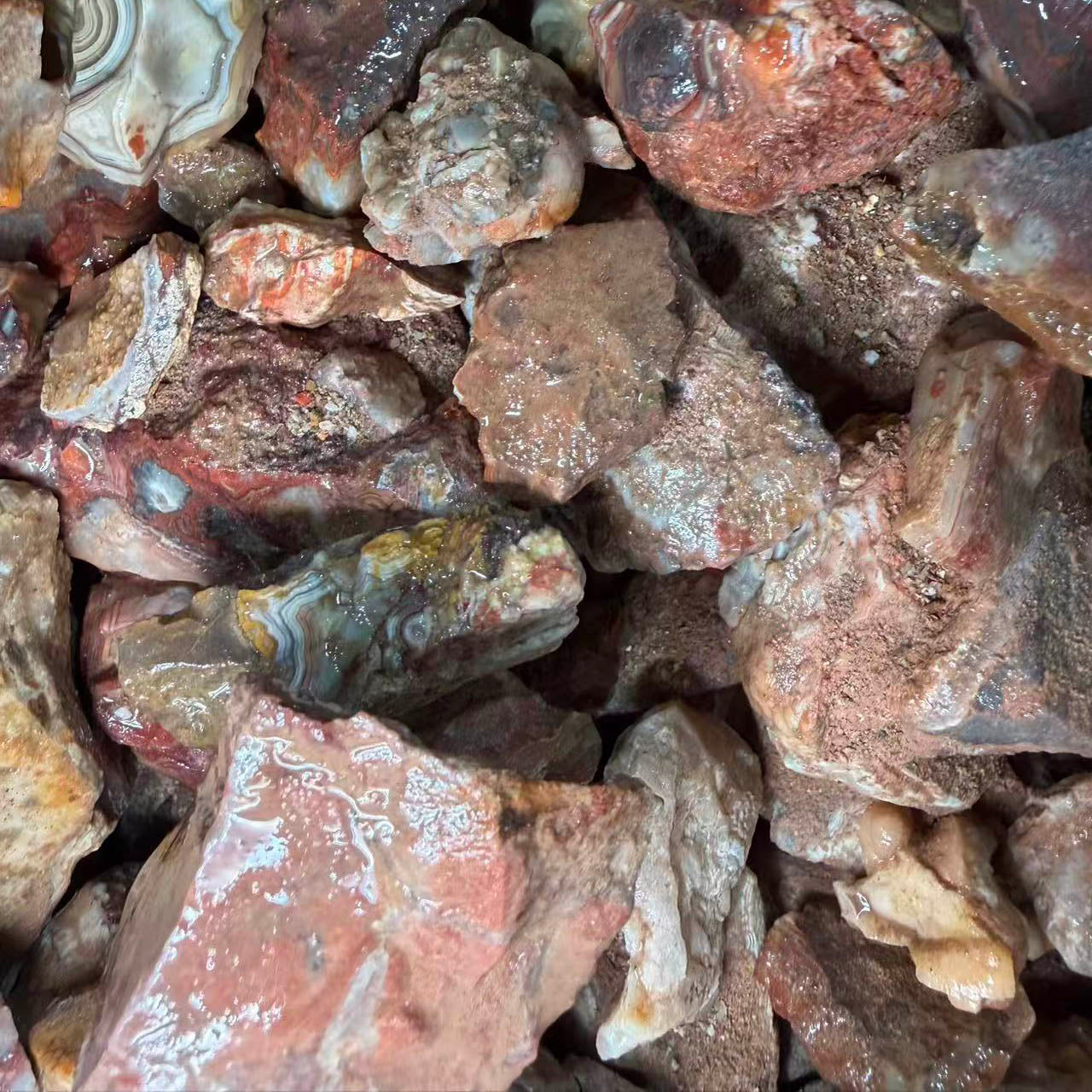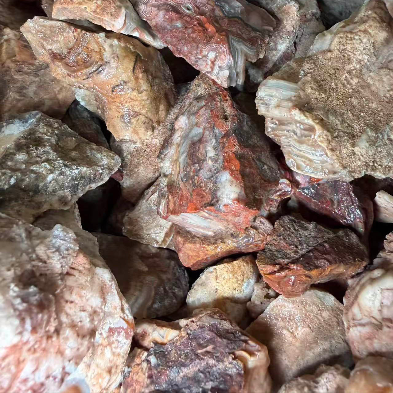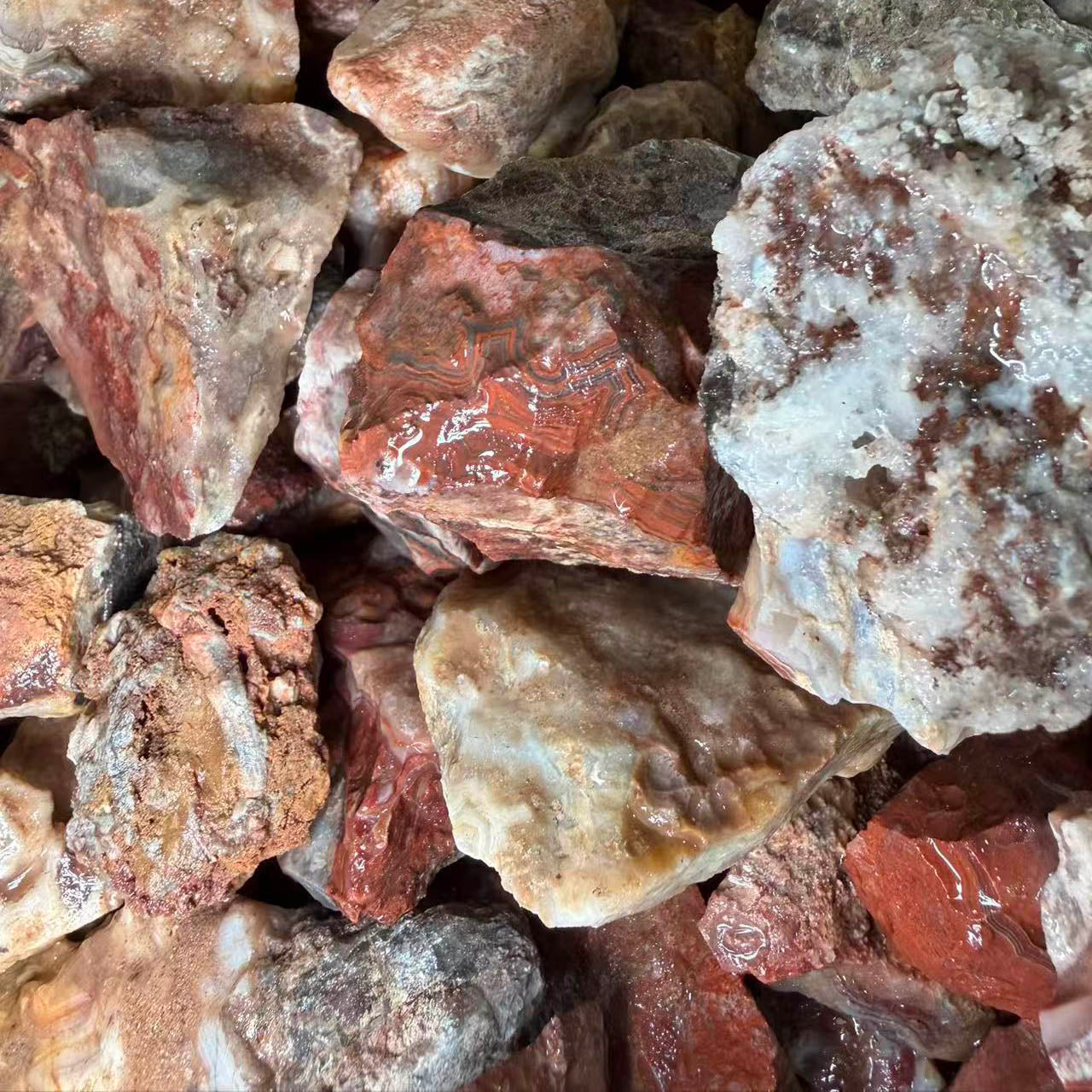 Crazy Lace Agate features intricate swirling patterns in reds, whites, and grays and is ideal for cabbing, tumbling, slab cutting, and decorative carvings. Crazy Lace Agate has a Mohs hardness of 6.5–7, allowing lapidary artists to achieve a polished finish that highlights its complex, lace-like patterns for jewelry or display pieces.
