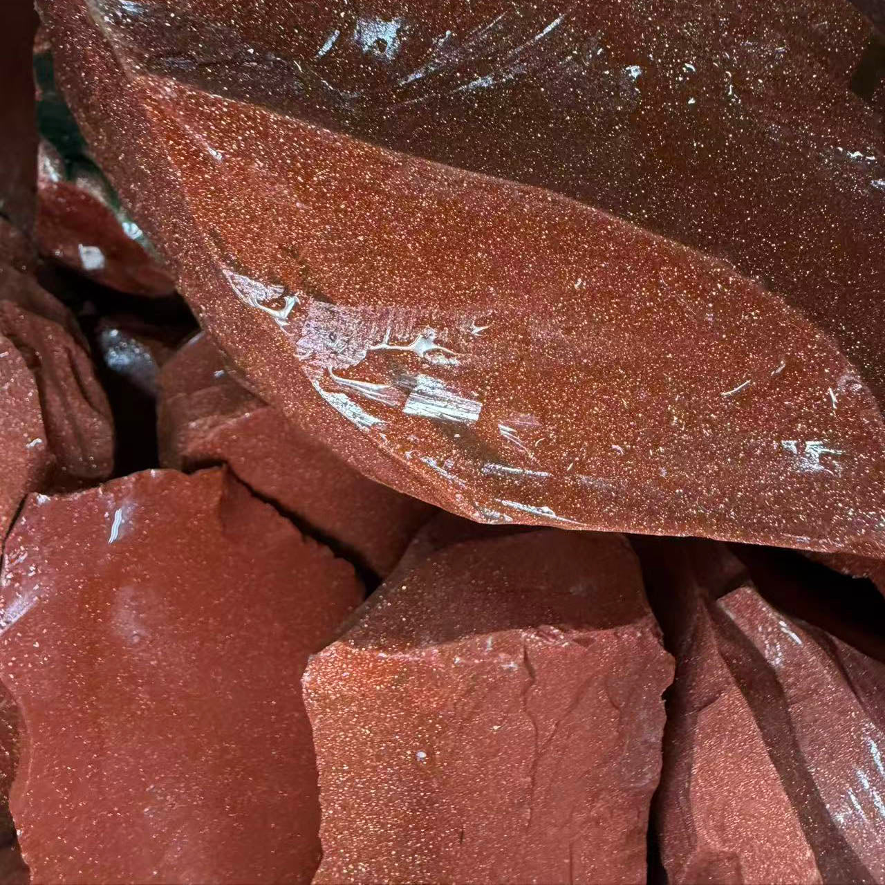 Gold Goldstone rough is a man-made glass with golden copper flecks suspended in a deep brown matrix. It is excellent for cabbing, tumbling, and display pieces. With a Mohs hardness of 5.5–6, it polishes to a brilliant shine, allowing lapidary artists to create dazzling jewelry or decorative stones.
