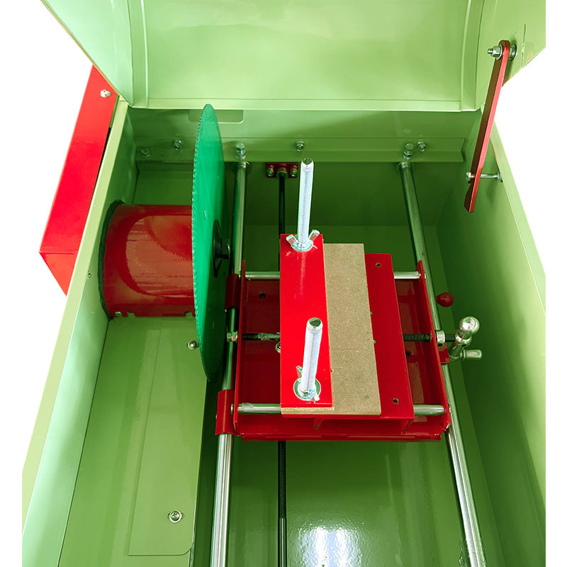 Model HT14 ‒ 14 inches glass coldworking and equipment precision diamond lapidary slab saw with heavy-gauge, powder-coated steel tank, powerfeed, crossfeed vise, and 1/2 HP 230v motor. Greenline Agate Eater sintered diamond blade included.